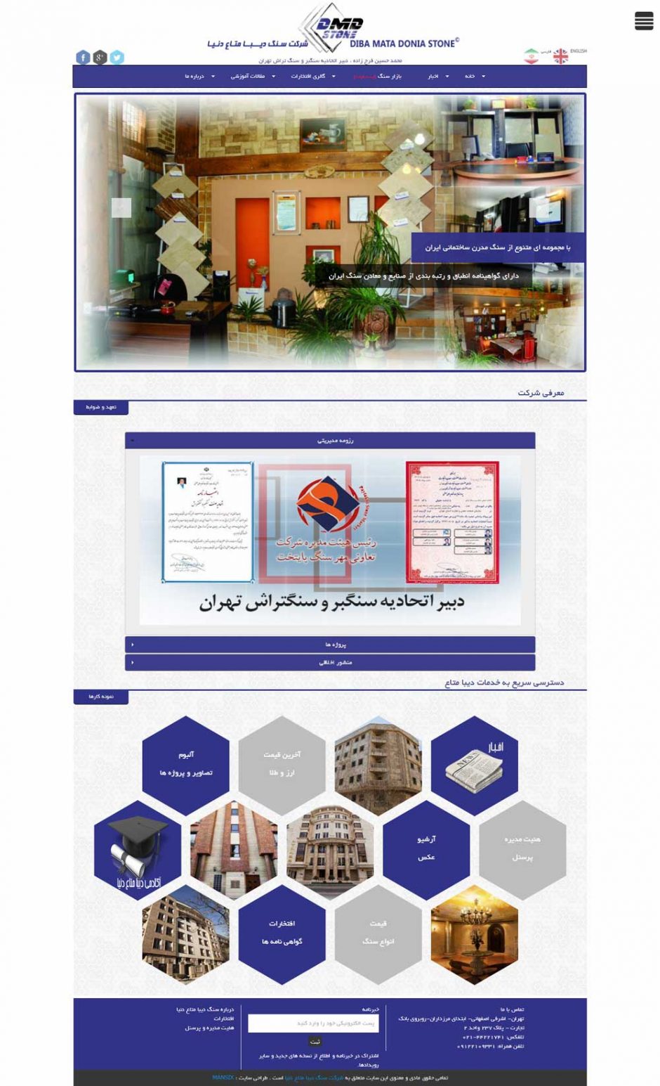 طراحی سایت شرکت سنگ دیبا متاع دنیا با شماره ثبتی 401810 در جهت تامین و مشاوره تخصصی سنگ های ساختمانی با مدیریت آقای محمد حسین فرج زاده تاسیس گردیده است. طراحی وب سایت این مجموعه توسط شرکت طراحی سایت در کرج منسیکس انجام گردیده است. که در حال حاضر این مجموعه با برخورداری از پرسنل مجرب تلاش کرده است. تا گامی ارزشمند در راستای افزایش رضایتمندی مشتریان خود در سازمان ها و وزارتخانه هایی همچون: